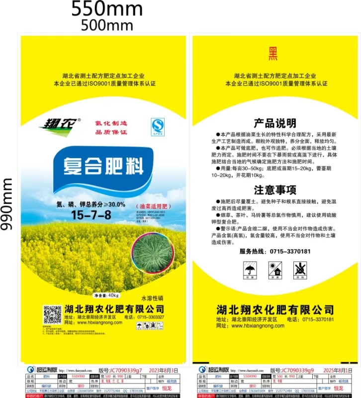 湖北省農(nóng)業(yè)廳春、秋季主推肥料產(chǎn)品。“翔農(nóng)”牌復合肥授予“湖北省名牌產(chǎn)品”、榮獲“湖北省著名商標”。“咸寧市農(nóng)業(yè)產(chǎn)業(yè)化市場重點龍頭企業(yè)”;公司以“保質(zhì)保量,服務三農(nóng)”為宗旨。用心做好每顆肥,真情回報全社會。充分體現(xiàn)“翔農(nóng)”品牌文化的親和力和感染力。